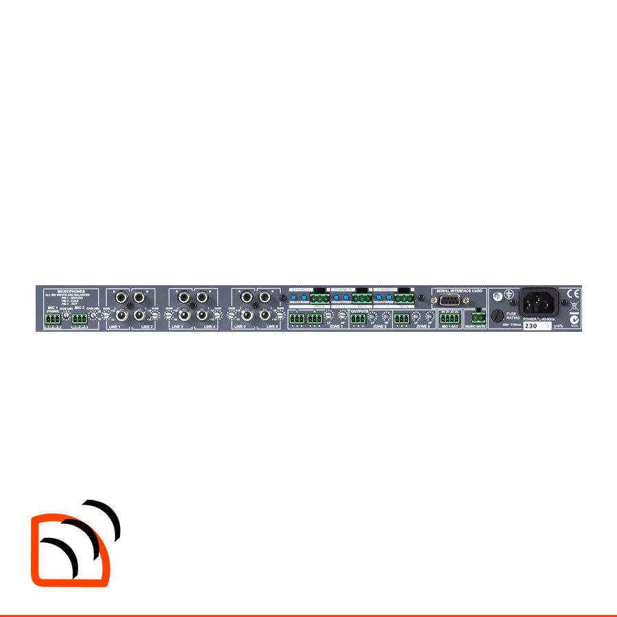 The CX263 has six stereo line inputs and two microphone inputs. It has three separate zone outputs, in each of which one of the line inputs and the microphone inputs may be mixed together. Separate user controls for music source selection, and music and individual mic levels are provided for each zone.