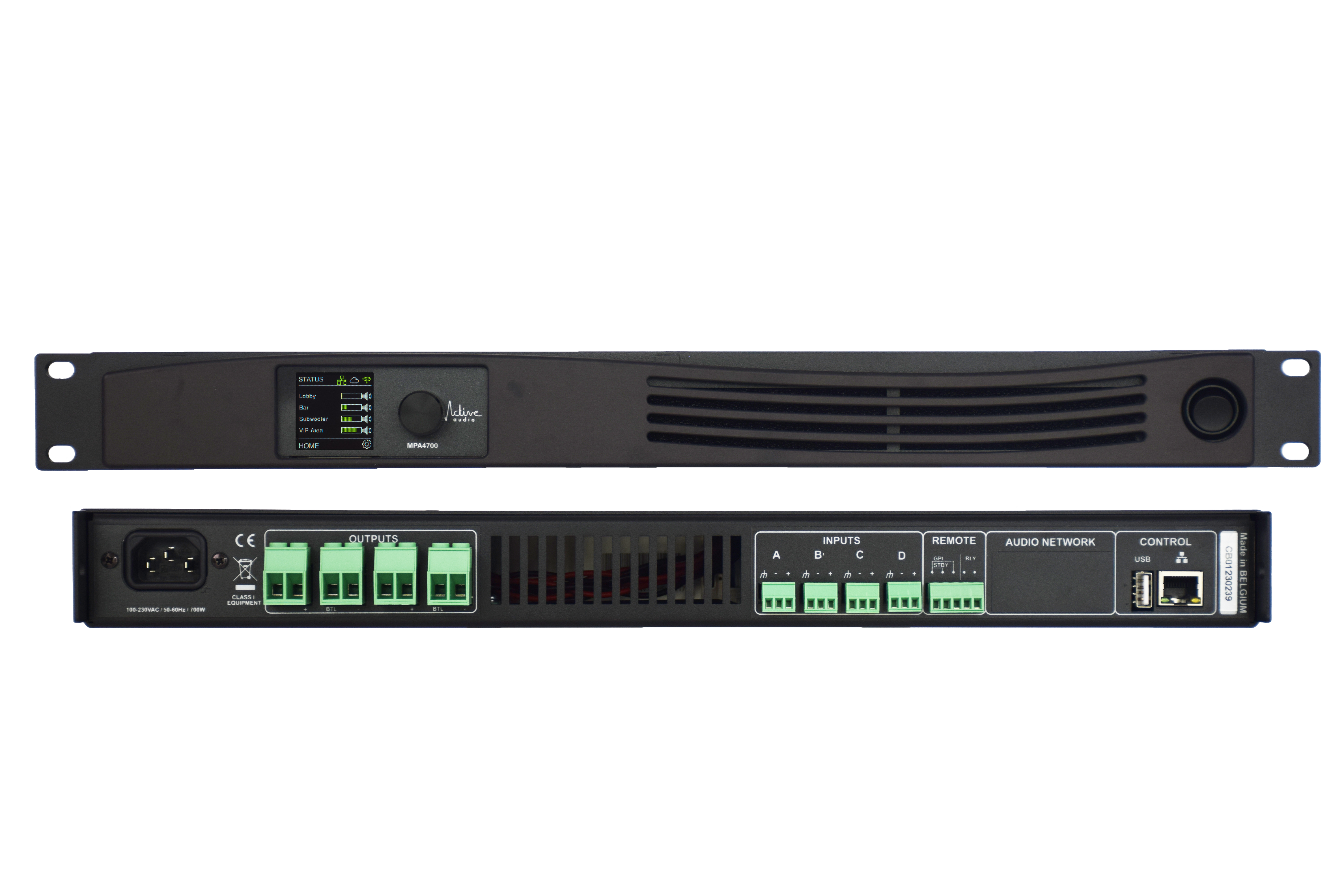 The Active Audio MPA4700 is a 4-channel power amplifier usable with Ray-On series or subwoofers, making it an ideal choice for audio active setups in professional and installation audio systems.