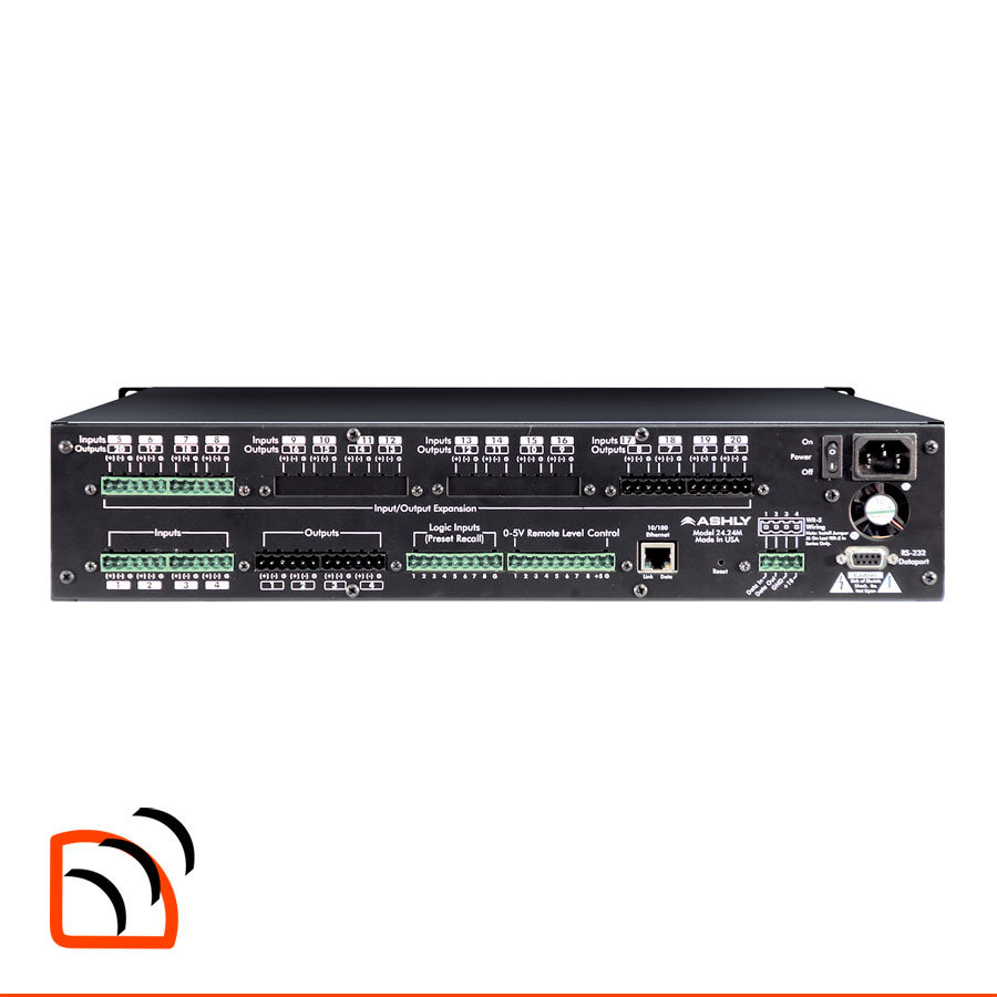 The Ashly ne24.24M uses modular expansion cards to provide up to 24-channels of audio matrixing and processing. The base unit offers a 4-input/4-output configuration. Each input and output expansion card has an individual DSP processor allowing you to expand the total input or output with 4 channels of DSP processing at a time. Cards are easily installed in the field without the need to reprogram the device.